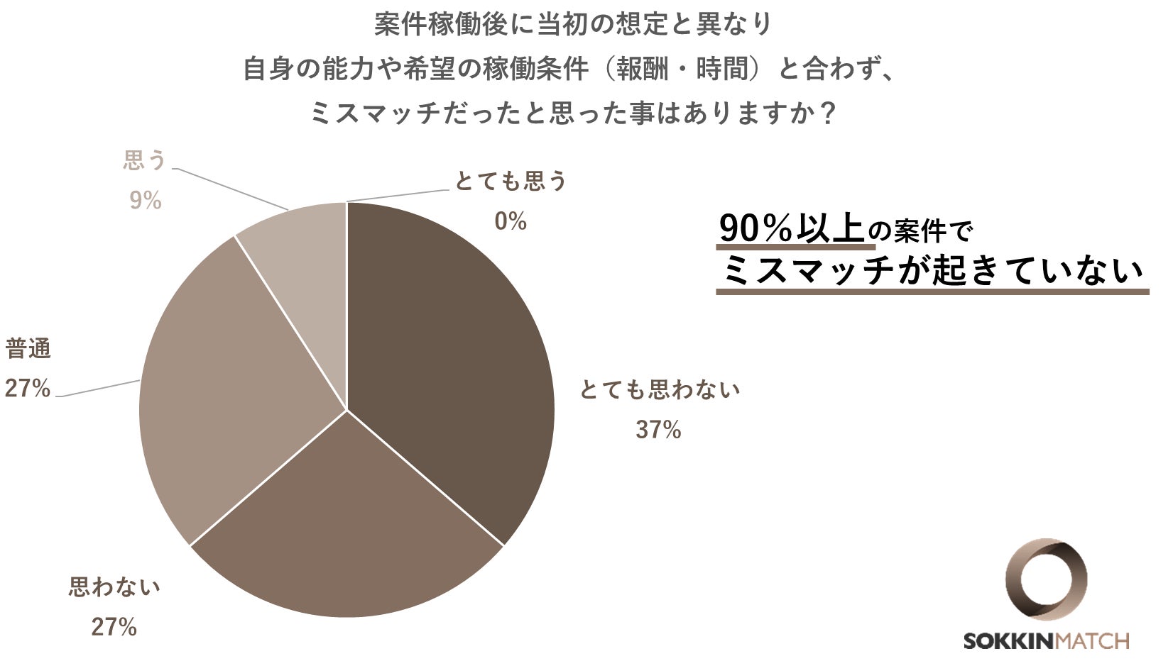 案件稼働後に当初の想定と異なり自身の能力や希望の稼働条件(報酬・時間)と合わず、ミスマッチだったと思った事はありますか?という問いに対して、約90%がミスマッチを感じておらず、SOKKIN MATCHが精度の高いマッチングが出来ていることが伺えます。